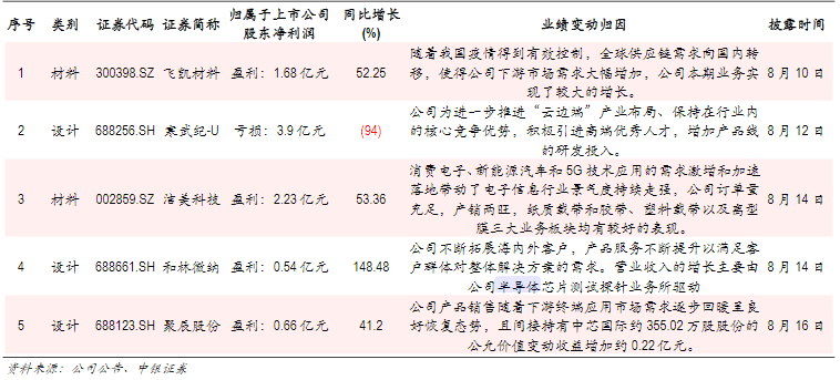上周共有5家半导体企业披露2021上半年业绩报告,其中仅寒武纪录得亏损,系研发投入高企所致。其余4家半导体企业均实现了40%以上的净利润增长。从公司业绩变动的归因来看,多数企业业绩增长来自下游需求带动,预计行业将持续保持高景气。