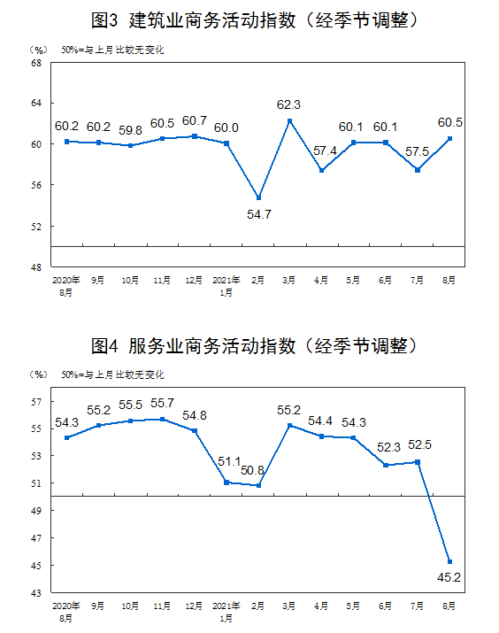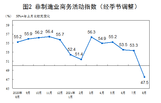8月份,非制造业商务活动指数为47.5%,低于上月5.8个百分点,降至临界点以下,表明受近期多省多点疫情等因素影响,非制造业景气度明显回落。