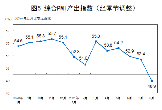 8月份,综合PMI产出指数为48.9%,比上月回落3.5个百分点,表明我国企业生产经营活动较上月明显放缓。