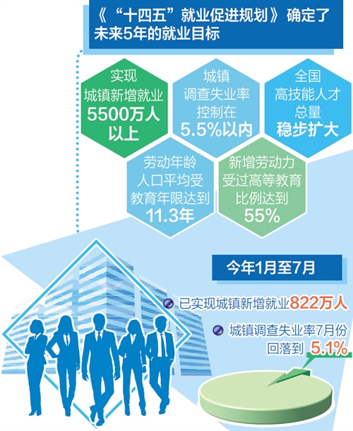最近公布的《“十四五”就业促进规划》确定了未来5年的就业目标:实现城镇新增就业5500万人以上,城镇调查失业率控制在5.5%以内。