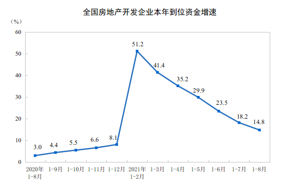 1—8月份,房地产开发企业到位资金134364亿元,同比增长14.8%;比2019年1—8月份增长18.1%,两年平均增长8.7%。其中,国内贷款16918亿元,下降6.1%;利用外资53亿元,下降47.5%;自筹资金40773亿元,增长9.3%;定金及预收款50997亿元,增长31.3%;个人按揭贷款21490亿元,增长13.4%。