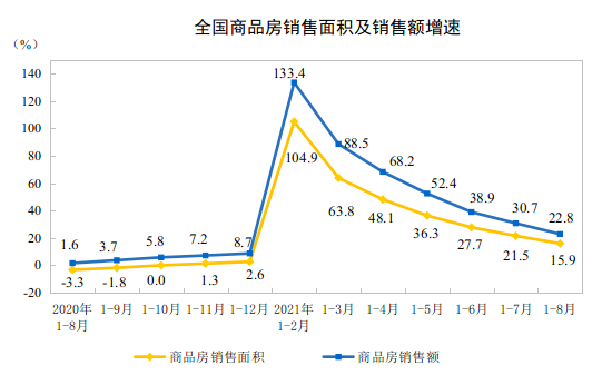1—8月份,商品房销售面积114193万平方米,同比增长15.9%;比2019年1—8月份增长12.1%,两年平均增长5.9%。其中,住宅销售面积增长16.5%,办公楼销售面积增长3.7%,商业营业用房销售面积增长2.1%。商品房销售额119047亿元,增长22.8%;比2019年1—8月份增长24.8%,两年平均增长11.7%。其中,住宅销售额增长24.5%,办公楼销售额增长3.5%,商业营业用房销售额增长3.3%。