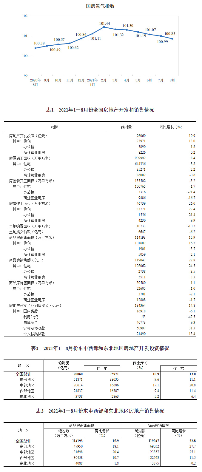 8月份,房地产开发景气指数(简称“国房景气指数”)为100.85。