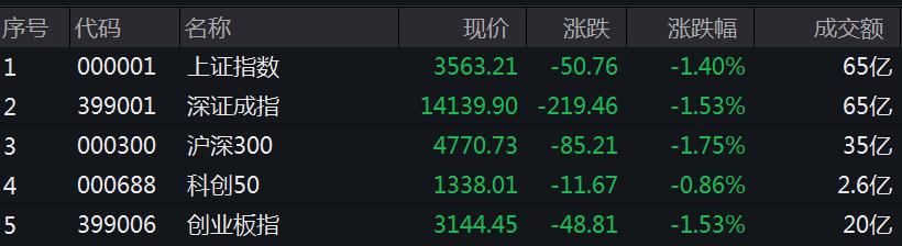 9月22日电 中秋假期后首个交易日,三大指数集体低开。上证指数跌1.40%,报3563.21点,深证成指跌1.53%,报14139.90点,创业板指跌1.53%,报3144.45点。