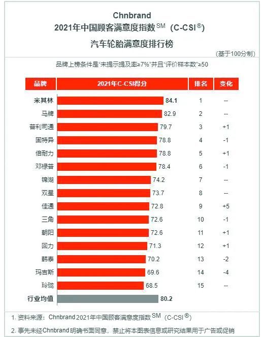 品牌评级权威机构Chnbrand发布2021年中国顾客轮胎满意度指数品牌排名和分析报告。其中,米其林连续5年卫冕第一;德国马牌连续两年位居第二;普利司通升至第三,去年排名第三的固特异下滑到第四;榜单前十名中,国产轮胎中只有双星和三角两个品牌。
