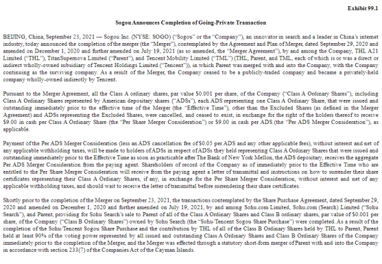 公告称,基于搜狗与THL A21 Limited (THL)、TitanSupernova Limited(母公司)、Tencent Mobility Limited (TML)于2020年9月29日签署的合并协议和计划、2020年12月1日的修订、2021年7月19日进一步修订协议及其项下与之相关的协议,母公司将与搜狗合并,搜狗将作为存续公司继续运营。合并完成后,搜狗将成为腾讯控股间接全资子公司,并完成退市。
