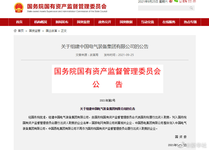 国务院国资委25日发布公告称,经国务院批准,组建中国电气装备集团有限公司,由国务院国有资产监督管理委员会代表国务院履行出资人职责,列入国务院国有资产监督管理委员会履行出资人职责的企业名单。国家电网有限公司所属相关企业、中国西电集团有限公司整体划入中国电气装备集团有限公司。中国西电集团有限公司不再作为国务院国有资产监督管理委员会履行出资人职责的企业。(记者王希)