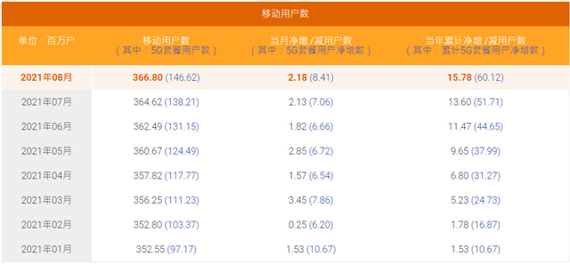 近日,中国电信公布了2021年8月主要运营数据。当月,中国电信移动用户数净增218万户,移动用户数累计3.6680亿户。当月5G套餐用户净增841万户,5G套餐用户数累计1.4662亿户。