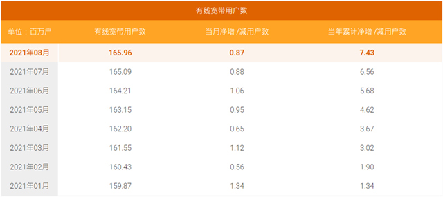 有线宽带业务方面,当月,中国电信有线宽带用户数净增87万户,有线宽带累计用户数1.6596亿户。固定电话业务方面,当月中国电信固定电话用户数净减1万户,固定电话累计用户数1.0711亿户。