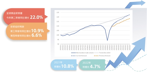 2021年全球商品贸易额的年增长率如此之高,主要因为2020年全球贸易出现了衰退。由于基数较低,2021年第二季度同比增长22.0%,但预计第三季度和第四季度将降至同比增长10.9%和6.6%。世贸组织预计2021年全球GDP将增长5.3%,高于今年3月份预测的5.1%。到2022年,这一增长率将放缓至4.1%。