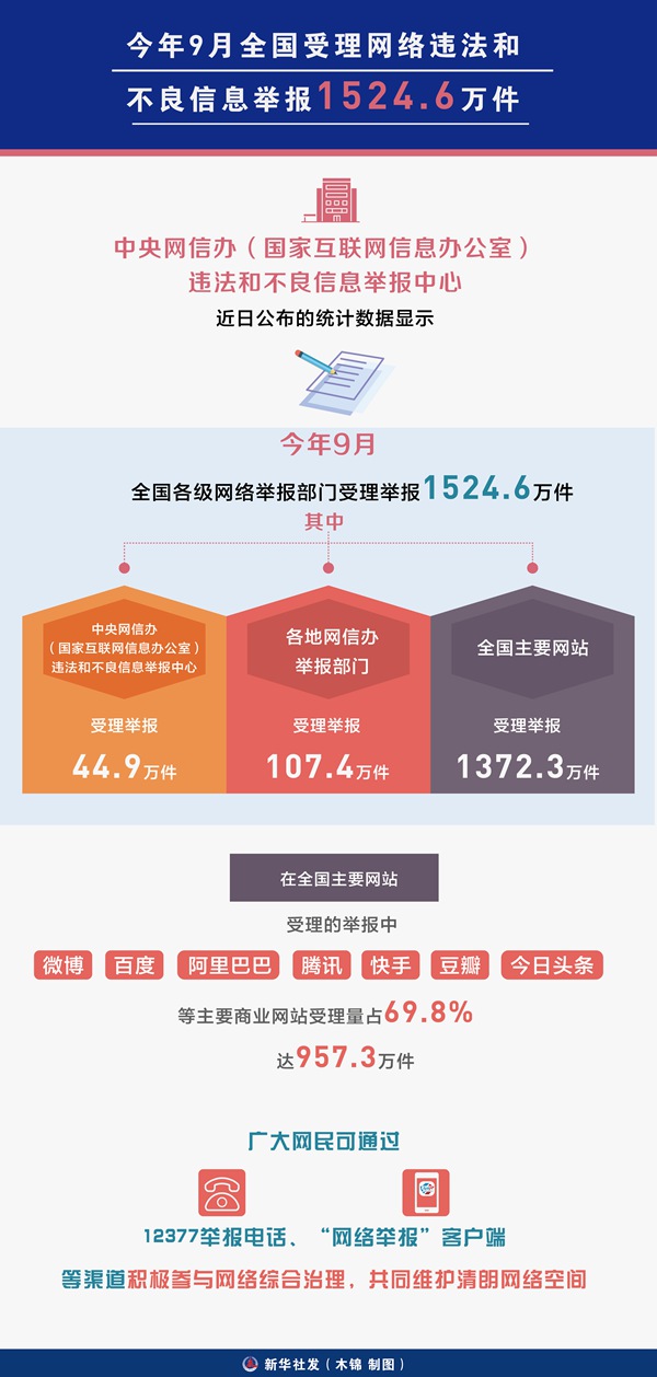 新华社北京10月11日电(记者王思北)中央网信办(国家互联网信息办公室)违法和不良信息举报中心近日公布的统计数据显示,今年9月,全国各级网络举报部门受理举报1524.6万件。
