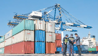 今年,山东自贸试验区烟台片区推行“两步申报”、“先出区后报关”等投资贸易便利化改革,压缩船舶进出港时限,大力优化营商环境。图为10月12日,在山东港口烟台港国际集装箱码头,海关关员对外贸集装箱进行现场监管。 唐 克摄(人民视觉)