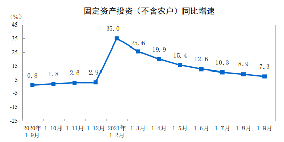 1—9月份,全国固定资产投资(不含农户)397827亿元,同比增长7.3%;比2019年1—9月份增长7.7%,两年平均增长3.8%。其中,民间固定资产投资227473亿元,同比增长9.8%。从环比看,9月份固定资产投资(不含农户)增长0.17%。