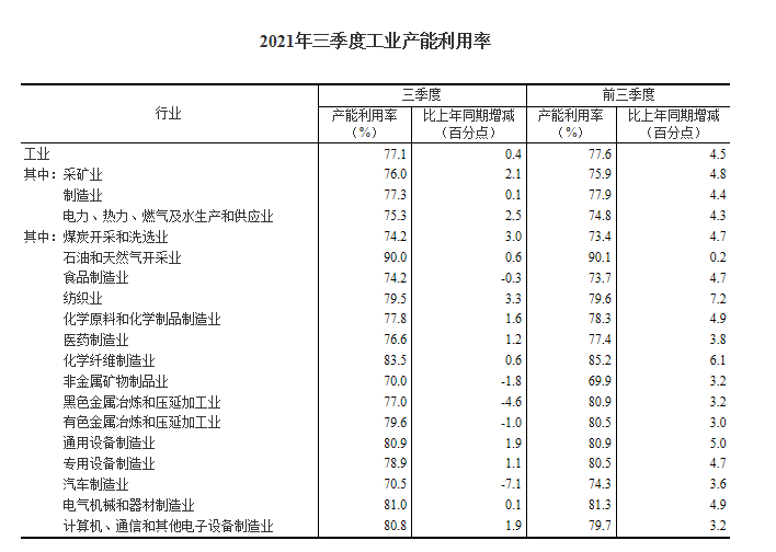 分主要行业看,三季度,煤炭开采和洗选业产能利用率为74.2%,食品制造业为74.2%,纺织业为79.5%,化学原料和化学制品制造业为77.8%,非金属矿物制品业为70.0%,黑色金属冶炼和压延加工业为77.0%,有色金属冶炼和压延加工业为79.6%,通用设备制造业为80.9%,专用设备制造业为78.9%,汽车制造业为70.5%,电气机械和器材制造业为81.0%,计算机、通信和其他电子设备制造业为80.8%。