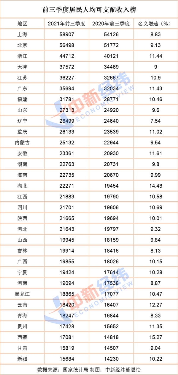 10月21日电 (熊思怡)20日晚间,国家统计局公布31省份前三季度居民人均可支配收入,上海、北京、浙江位居前三甲。