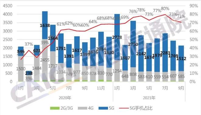 2021年1-9月,国内市场手机总体出货量累计2.49亿部,同比增长10.2%,其中,5G手机出货量1.83亿部,同比增长70.4%,占同期手机出货量的73.8%。