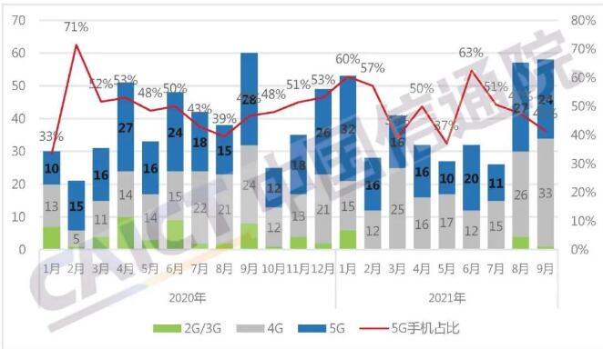 2021年9月,国内手机上市新机型58款,同比下降3.3%,其中5G手机24款,同比下降14.3%,占同期手机上市新机型数量的41.4%。