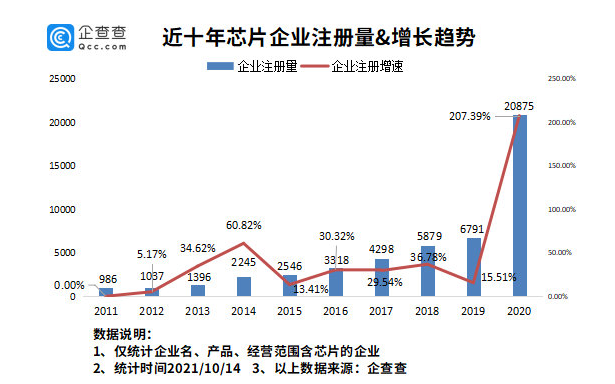 企查查数据显示,我国现存芯片相关企业 8.64 万家。2020 年我国新增芯片相关企业 2.09 万家,同比增长 207.39%。