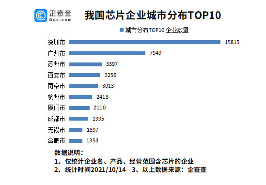 从城市分布来看,深圳市有 1.58 万家芯片相关企业,排名第一。广州有芯片相关企业 7949 家,位列第二。苏州 3397 家,排名第三。此后依次为西安市、南京市、杭州市等。
