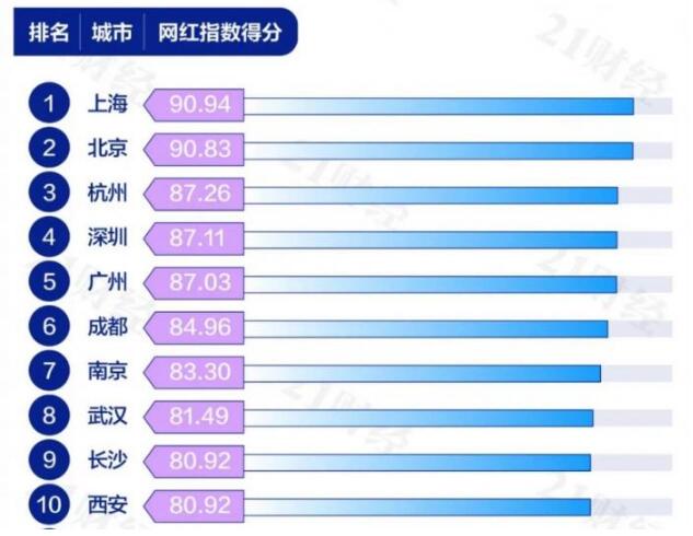 最终研究结果显示,上海、北京、杭州、深圳、广州、成都、南京、武汉、长沙、西安的网红指数得分位列前十。