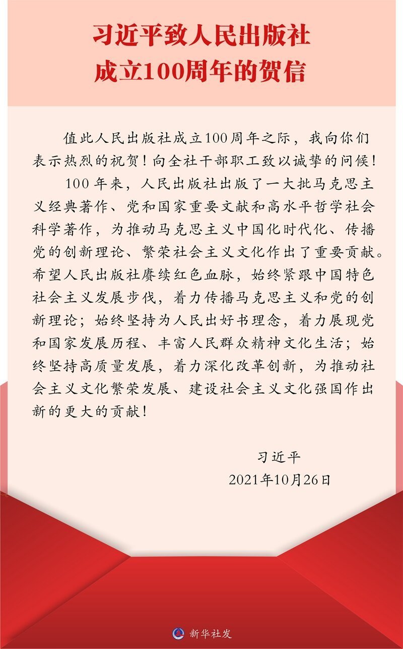 习近平在贺信中指出,100年来,人民出版社出版了一大批马克思主义经典著作、党和国家重要文献和高水平哲学社会科学著作,为推动马克思主义中国化时代化、传播党的创新理论、繁荣社会主义文化作出了重要贡献。