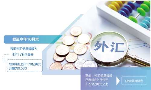 近日,国家外汇管理局公布的最新外汇储备规模数据显示,截至今年10月末,我国外汇储备规模为32176亿美元,较9月末上升170亿美元,升幅为0.53%。至此,外汇储备规模已连续6个月位于3.2万亿美元之上,总体保持稳定。