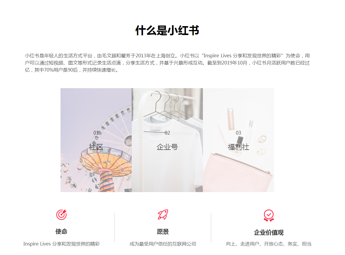 小红书官网资料显示,小红书是年轻人的生活方式平台,由毛文超和瞿芳于2013年在上海创立。小红书以“Inspire Lives 分享和发现世界的精彩”为使命,用户可以通过短视频、图文等形式记录生活点滴,分享生活方式,并基于兴趣形成互动。截至到2019年10月,小红书月活跃用户数已经过亿,其中70%用户是90后,并持续快速增长。