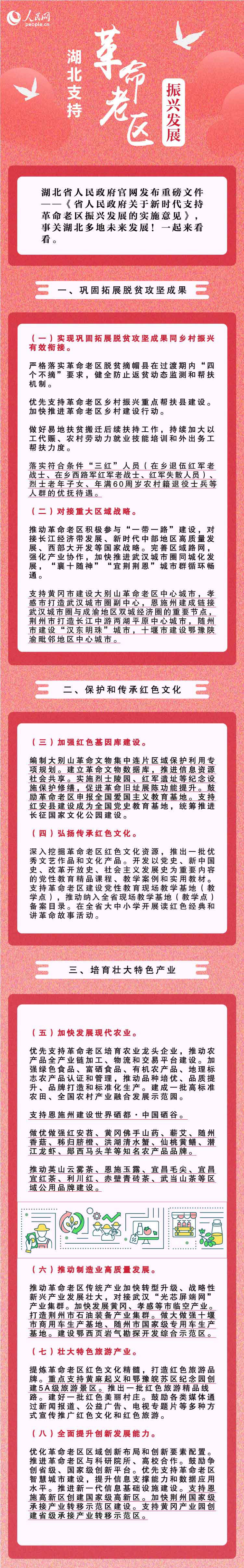 《实施意见》从基础设施建设、巩固拓展脱贫攻坚成果、生态环境保护修复、发展红色旅游、保护和传承红色文化、培育壮大特色产业、提升公共服务能力等七方面,细化出20条具体措施,指导并支持革命老区振兴发展。