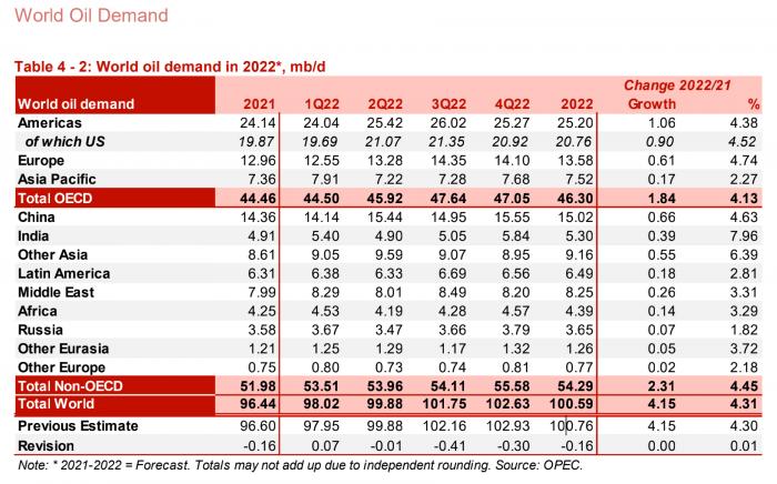 EIA还进一步表示,“我们预计,随着欧佩克+和美国产量增加,以及全球石油需求增长放缓,将推动全球石油库存在2022年开始增加。”