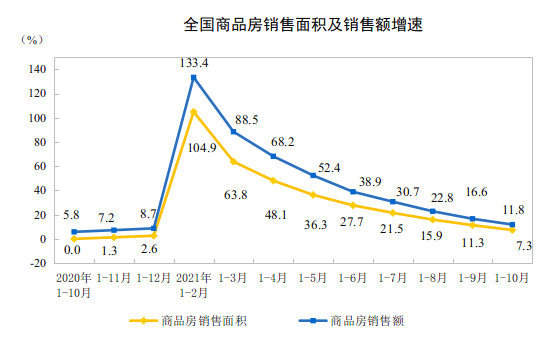 1—10月份,商品房销售面积143041万平方米,同比增长7.3%;比2019年1—10月份增长7.3%,两年平均增长3.6%。其中,住宅销售面积增长7.1%,办公楼销售面积增长2.4%,商业营业用房销售面积下降0.6%。商品房销售额147185亿元,增长11.8%;比2019年1—10月份增长18.3%,两年平均增长8.8%。其中,住宅销售额增长12.7%,办公楼销售额下降1.6%,商业营业用房销售额下降0.6%。