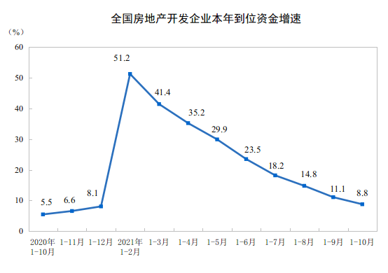 1—10月份,房地产开发企业到位资金166597亿元,同比增长8.8%;比2019年1—10月份增长14.8%,两年平均增长7.1%。其中,国内贷款20148亿元,下降10.0%;利用外资72亿元,下降35.4%;自筹资金52617亿元,增长5.1%;定金及预收款62040亿元,增长21.0%;个人按揭贷款26678亿元,增长9.7%。