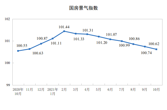 10月份,房地产开发景气指数(简称“国房景气指数”)为100.62。