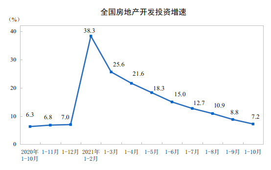 1—10月份,全国房地产开发投资124934亿元,同比增长7.2%;比2019年1—10月份增长14.0%,两年平均增长6.8%。其中,住宅投资94327亿元,增长9.3%。