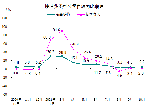 按消费类型分,10月份,商品零售35994亿元,同比增长5.2%;餐饮收入4460亿元,增长2.0%。1—10月份,商品零售321300亿元,同比增长13.8%;餐饮收入37211亿元,增长25.7%。