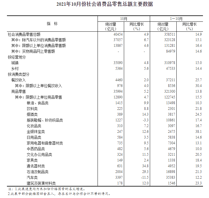按经营单位所在地分,10月份,城镇消费品零售额35090亿元,同比增长4.8%;乡村消费品零售额5364亿元,增长5.6%。1—10月份,城镇消费品零售额310978亿元,同比增长15.0%;乡村消费品零售额47533亿元,增长14.4%。