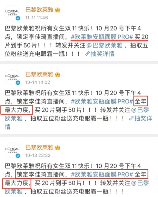 此外,黑猫投诉等账号主体发布的网友截图显示,巴黎欧莱雅官方微博曾在10月13日、10月14日和11月11日先后三次发布相关微博,其中有“锁定李佳琦直播间”、“全年最大力度”等相关表述。