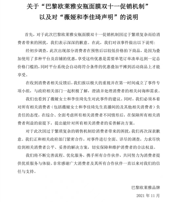 11月18日凌晨2:15,巴黎欧莱雅官方微博发布声明,对“促销机制因过于复杂而给消费者带来的困扰”致歉。在对“薇娅和李佳琦声明”事件作出说明后,声明表示,“我们必须本着对所有相关消费者(包括薇娅女士和李佳琦先生直播间的及其他相关消费者)负责任的态度,巴黎欧莱雅在综合、全面考虑所有相关消费者不同情形后,在保障所有相关消费者利益的前提下,提出能针对所有相关消费者的妥善解决方案。”