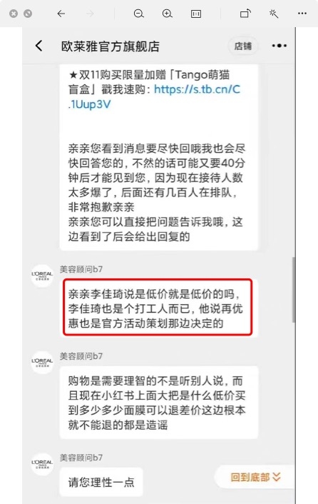 根据黑猫投诉发布的相关资料,欧莱雅客服在向消费者解释安瓶面膜差价问题时称:“李佳琦说是低价就是低价的吗?李佳琦也是个打工人而已。”