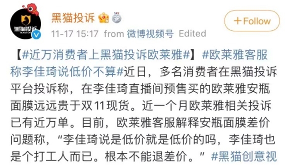 11月17日下午,新浪黑猫消费者服务官方平台微博“黑猫投诉”称,近日,多名消费者在黑猫投诉平台投诉称,在李佳琦直播间预售买的欧莱雅安瓶面膜远远贵于“双十一”现货。近一个月欧莱雅相关投诉已有近万单。