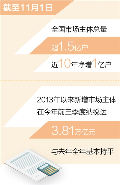 最新数据显示,截至11月1日,全国市场主体总量超1.5亿户,近10年净增1亿户。亿万市场主体的磅礴力量推动了我国经济总量、国家财力和社会财富稳定增长,承载了7亿多人就业的基本盘。