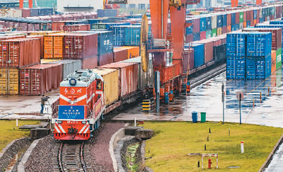 今年以来,中欧班列浙江金东平台联合铁路、海关等部门,精准服务,搭建外贸绿色通道。图为X9216/5次“杭叉号”中欧班列从浙江金华南站启程,经霍尔果斯出境,驶向哈萨克斯坦的梅杰乌。胡肖飞摄(人民视觉)