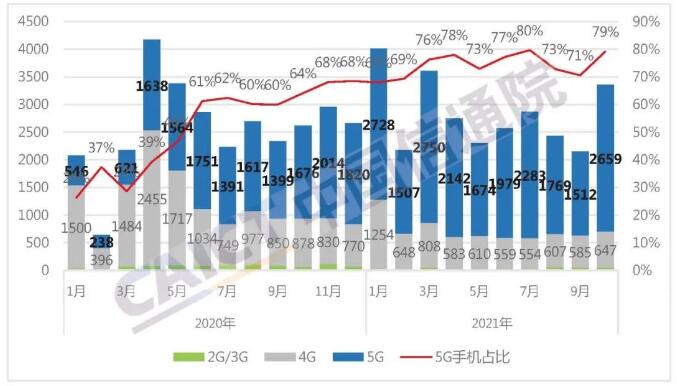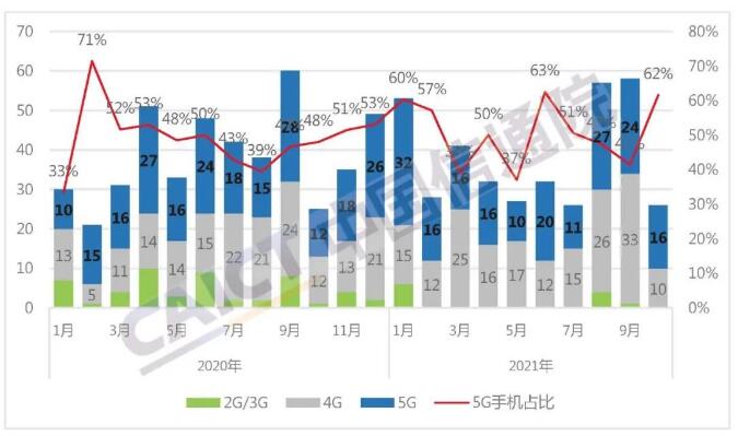 2021年1-10月,国内市场手机总体出货量累计2.82亿部,同比增长12.0%,其中,5G手机出货量2.10亿部,同比增长68.8%,占同期手机出货量的74.5%。