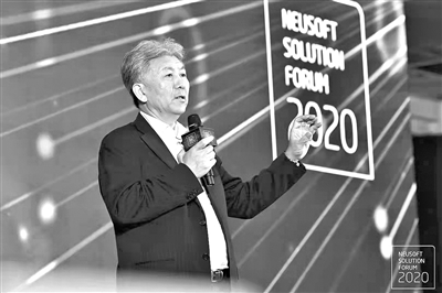 东软集团董事长刘积仁在东软解决方案论坛上做主旨演讲。 资料照片