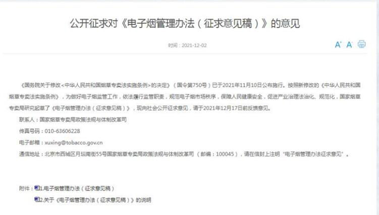 据国家烟草专卖局网站消息,按照新修改的《中华人民共和国烟草专卖法实施条例》,国家烟草专卖局研究起草了《电子烟管理办法(征求意见稿)》(以下简称《管理办法》),现向社会公开征求意见。其中: