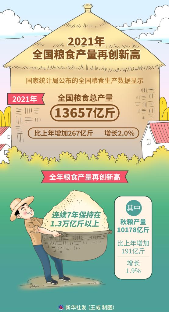 北京12月6日电(记者魏玉坤)国家统计局6日发布数据,2021年全国粮食总产量达13657亿斤,比上年增加267亿斤,增长2.0%,全年粮食产量再创新高,连续7年保持在1.3万亿斤以上。