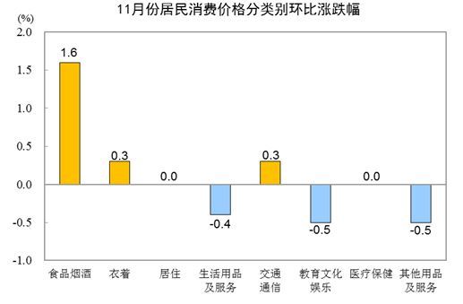 11月份,食品烟酒类价格同比上涨1.7%,影响CPI(居民消费价格指数)上涨约0.49个百分点。食品中,鲜菜价格上涨30.6%,影响CPI上涨约0.60个百分点;蛋类价格上涨17.6%,影响CPI上涨约0.10个百分点;水产品价格上涨8.5%,影响CPI上涨约0.15个百分点;鲜果价格上涨4.1%,影响CPI上涨约0.07个百分点;粮食价格上涨1.5%,影响CPI上涨约0.03个百分点;畜肉类价格下降19.7%,影响CPI下降约0.81个百分点,其中猪肉价格下降32.7%,影响CPI下降约0.68个百分点。
