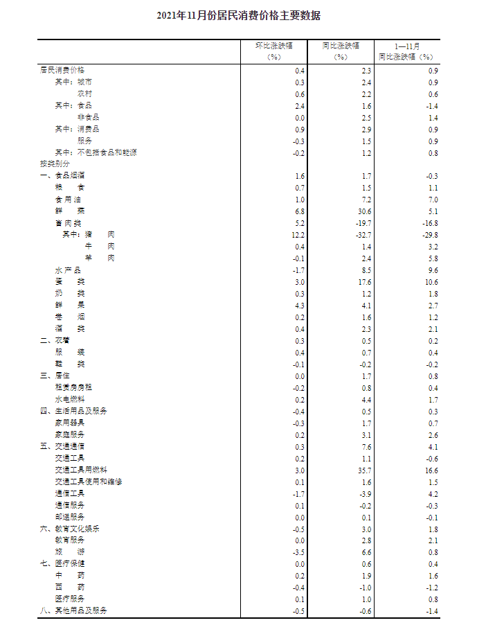 2021年11月份居民消费价格同比上涨2.3% 环比上涨0.4%