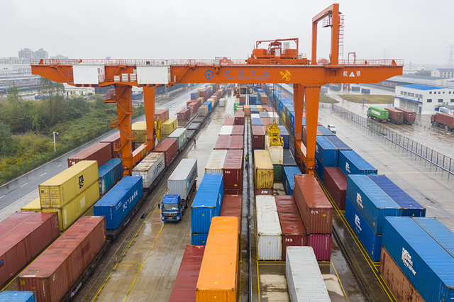 一批货物正在装车,准备从中欧班列金东平台发往哈萨克斯坦