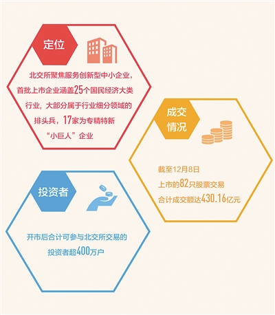 “资本市场中有了一个专属于创新型中小企业的舞台,这次聚光灯打在了我们身上!”不少北交所上市企业倍感振奋。北交所开市以来,市场运行总体平稳。截至12月8日,上市的82只股票交易合计成交额达430.16亿元。其中,71只平移股票累计成交295.2亿元;11只新股成交134.97亿元,平均涨幅101.49%。