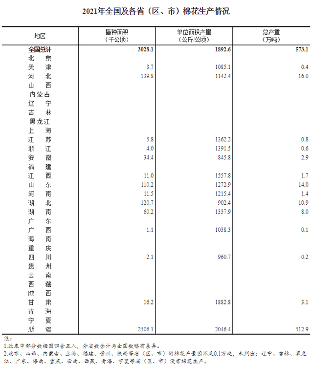 根据对全国31个省(区、市)的统计调查(新疆棉花播种面积通过遥感测量取得),2021年全国棉花播种面积、单位面积产量和总产量分别如下: